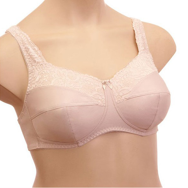 Бюстгальтер для фиксации протеза молочной железы из эластичного кружева и эластичного трикотажного полотна, с втачными карманами для протеза из х/б трикотажного полотна.