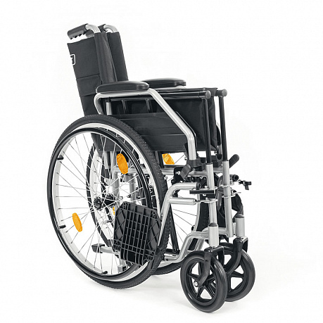 Съемные антиопрокидыватели делают езду в гору безопасной. Коляска снабжена откидными подножками и стояночным тормозом, что делает пересаживание человека из коляски и в неё более безопасным и удобным.