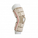 В ортезе использован классический принцип 3-точечной коррекции, реализуемый с помощью системы нерастяжимых ремней и шарнирных шин с возможностью установки угла сгибания и разгибания в коленном суставе.